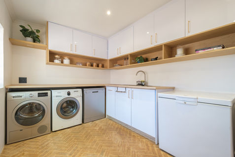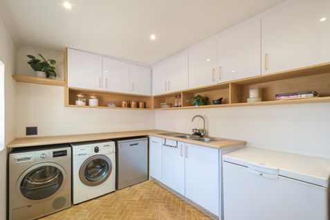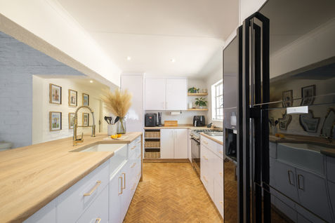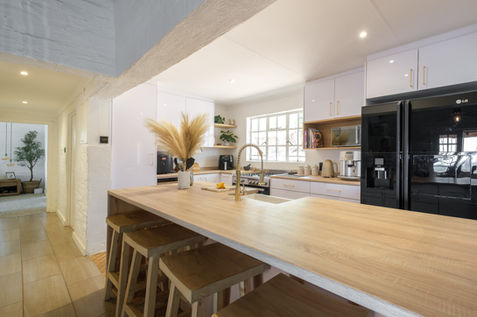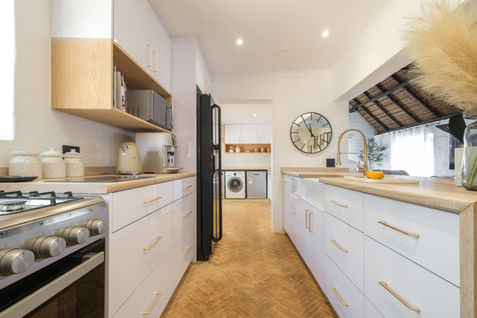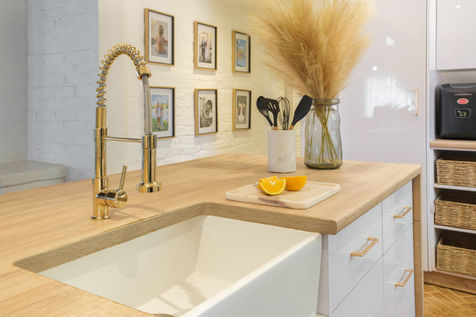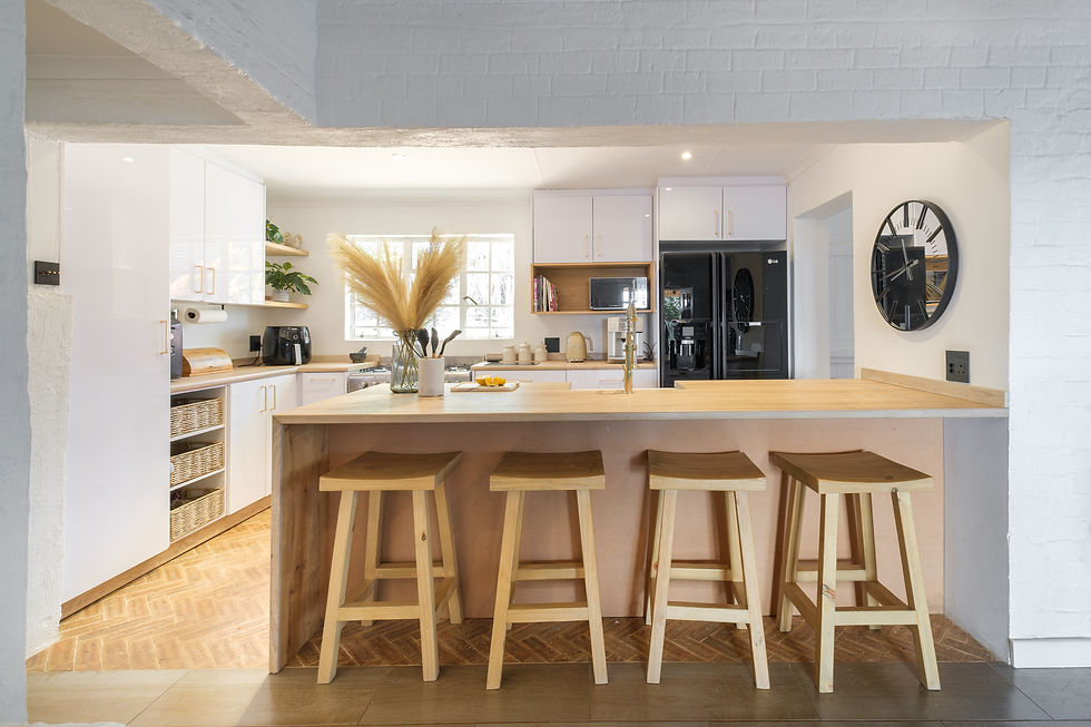 A Contemporary Modern Kitchen design inspired by Scandinavian simplicity, reimagined with the inviting warmth of farmhouse charm. Created on an incredibly tight budget, this kitchen balances woods, whites, and brick flooring to achieve a look that feels both cosy and practical. Clean lines and minimal forms evoke modern Scandinavian design, while natural textures and warm tones add a homely, lived-in character. The result is a stylish yet affordable kitchen that beautifully contrasts white surfaces with wood and stone, proving that comfort and sophistication can be achieved without excess.